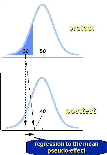 A regression threat, also known as a “regression artifact” or “regression to the mean” is a statistical phenomenon that occurs whenever you have a nonrandom sample from a population and two measures that are imperfectly correlated. The figure shows the regression to the mean phenomenon. The top part of the figure shows the pretest distribution for a population. Pretest scores are “normally” distributed, the frequency distribution looks like a “bell-shaped” curve. Assume that the sample for your study was selected exclusively from the low pretest scorers. You can see on the top part of the figure where their pretest mean is – clearly, it is considerably below the population average. What would we predict the posttest to look like? First, let’s assume that your program or treatment doesn’t work at all (the “null” case). Our naive assumption would be that our sample would score just as badly on the posttest as they did on the pretest. But they don’t! The bottom of the figure shows where the sample’s posttest mean would have been without regression and where it actually is. In actuality, the sample’s posttest mean wound up closer to the posttest population mean than their pretest mean was to the pretest population mean. In other words, the sample’s mean appears to regress toward the mean of the population from pretest to posttest.