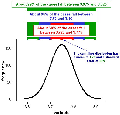 Perhaps an example will help. Let’s assume we did a study and drew a single sample from the population. Furthermore, let’s assume that the average for the sample was 3.75 and the standard deviation was .25. This is the raw data distribution depicted above. now, what would the sampling distribution be in this case? Well, we don’t actually construct it (because we would need to take an infinite number of samples) but we can estimate it. For starters, we assume that the mean of the sampling distribution is the mean of the sample, which is 3.75. Then, we calculate the standard error. To do this, we use the standard deviation for our sample and the sample size (in this case N=100) and we come up with a standard error of .025 (just trust me on this). Now we have everything we need to estimate a confidence interval for the population parameter. We would estimate that the probability is 68% that the true parameter value falls between 3.725 and 3.775 (i.e., 3.75 plus and minus .025); that the 95% confidence interval is 3.700 to 3.800; and that we can say with 99% confidence that the population value is between 3.675 and 3.825. The real value (in this fictitious example) was 3.72 and so we have correctly estimated that value with our sample.